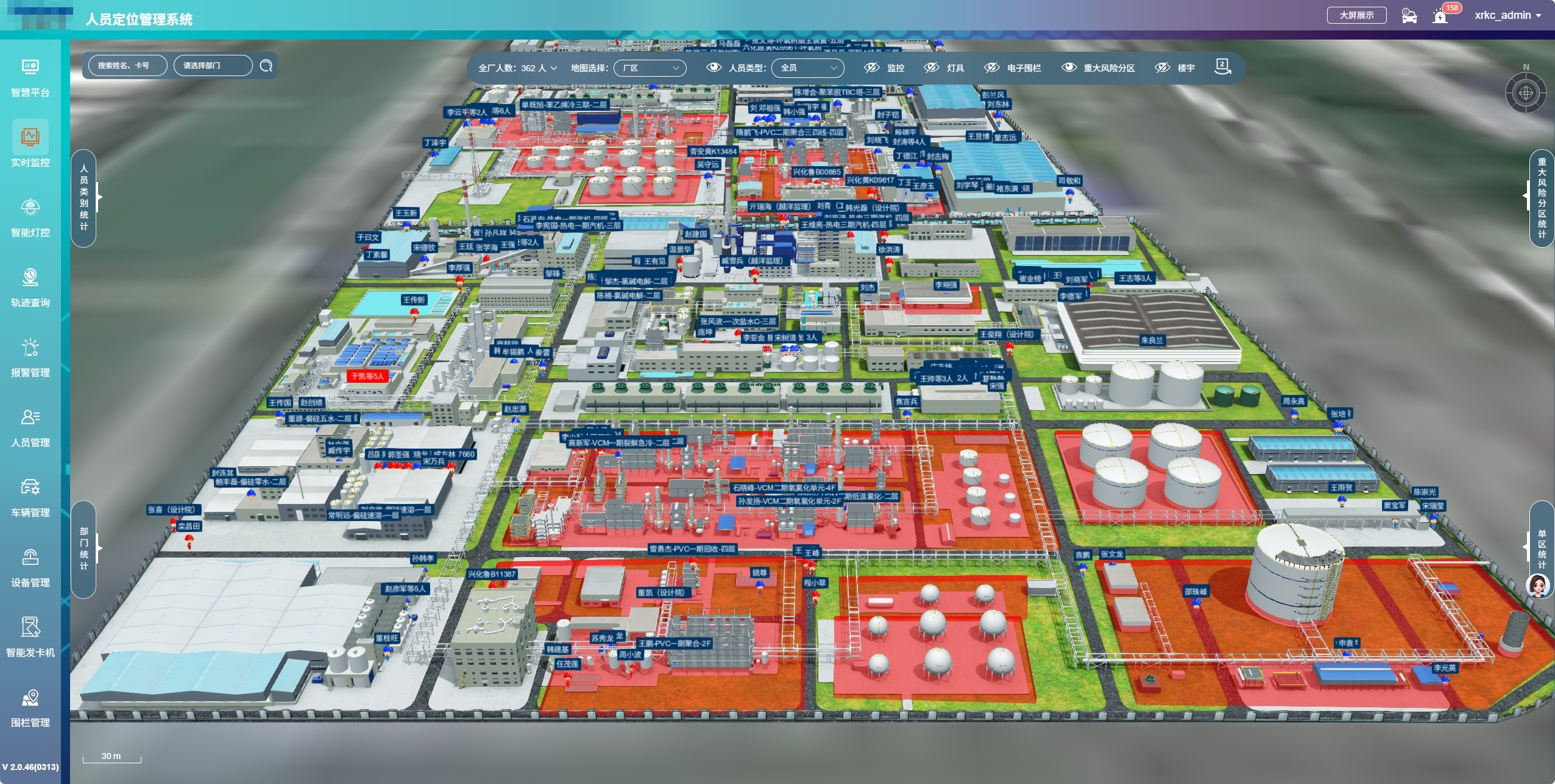 系統能在2D/3D電子地圖上實時顯示人員和車輛的位置分布,支持分樓層、分車間查看,還可對每個人和車輛進行實時位置追蹤。