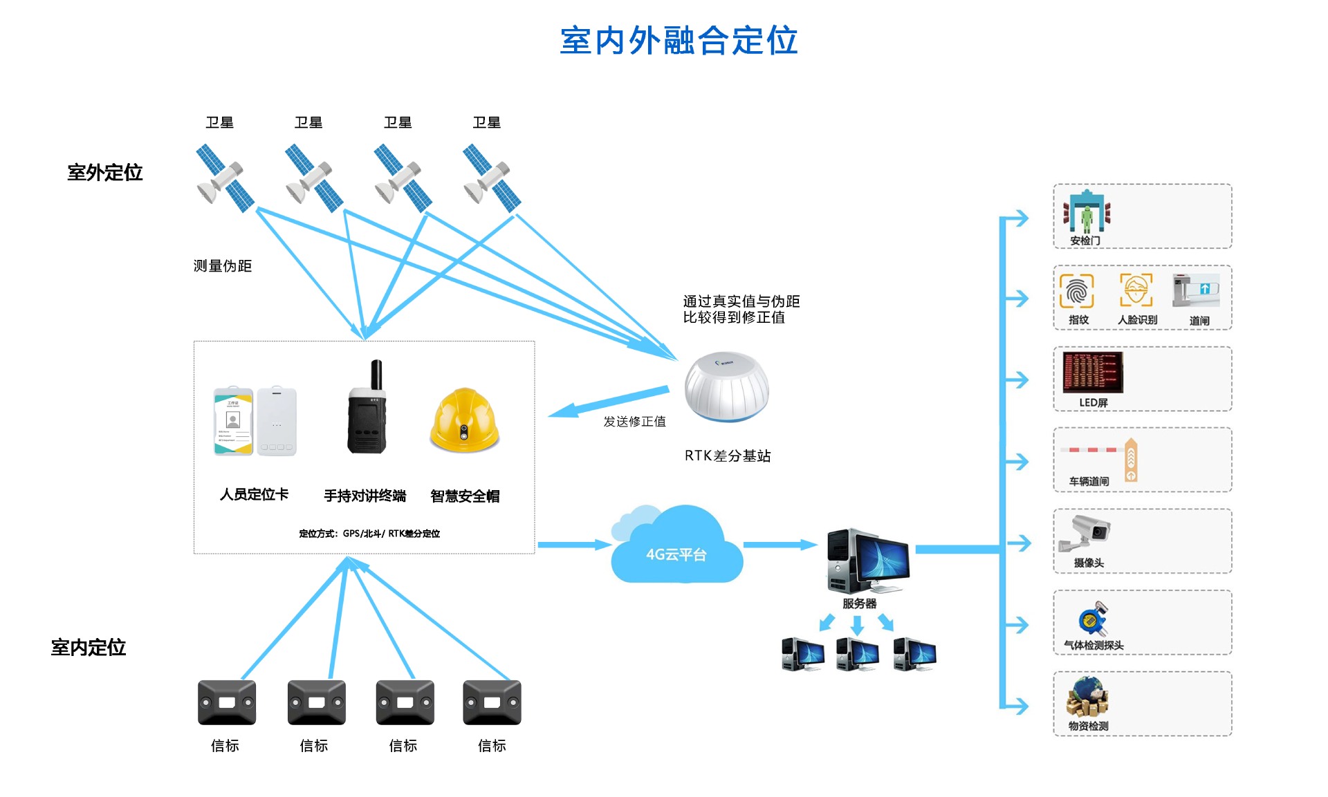 該系統(tǒng)融合藍牙、LoRa、GPS/北斗、RTK定位技術,利用4G/5G網(wǎng)絡傳輸數(shù)據(jù),室內(nèi)采用藍牙+LoRa定位,室外采用GPS/北斗RTK差分定位。