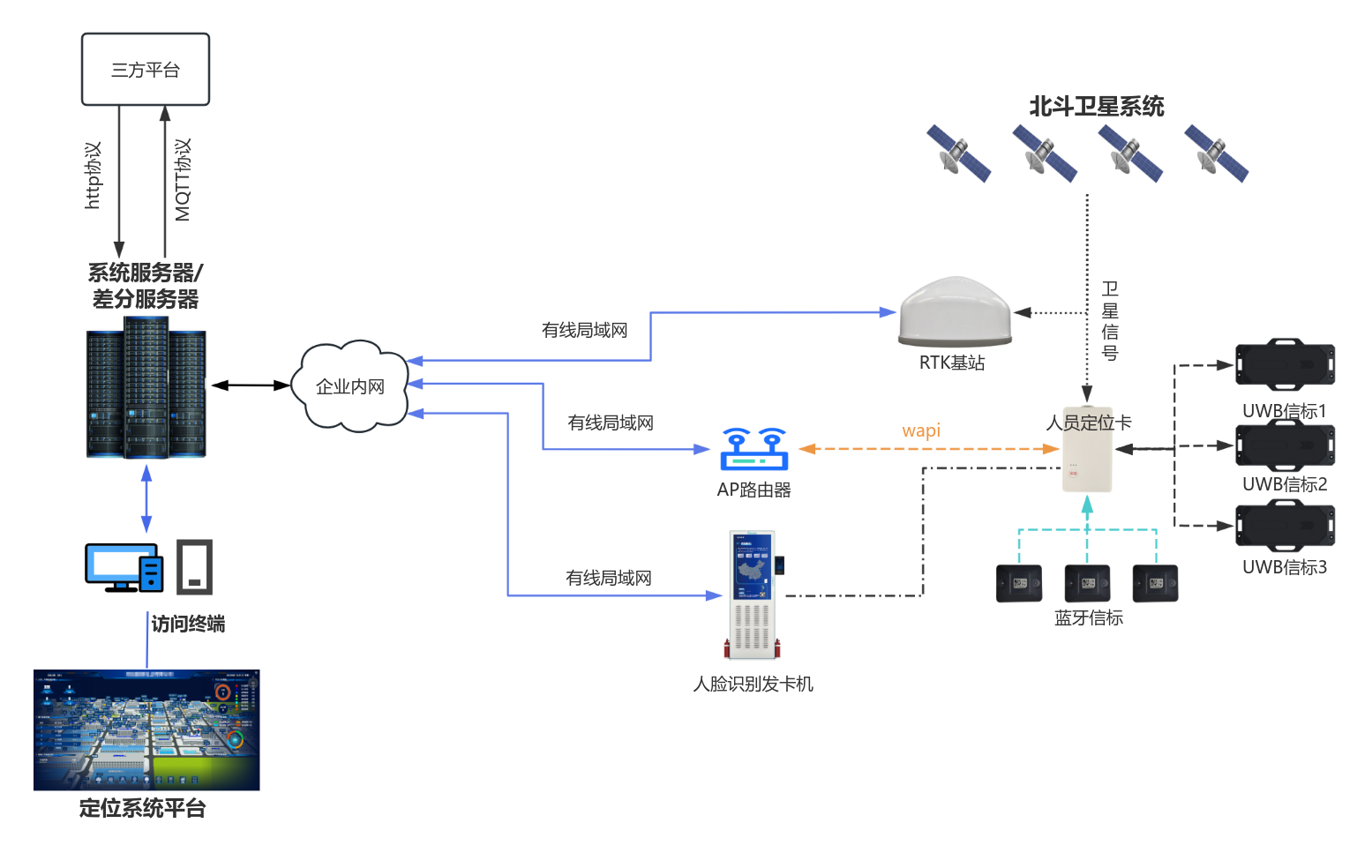 新銳科創(chuàng)WAPI+北斗RTK+藍(lán)牙+UWB融合定位系統(tǒng)方案拓?fù)鋱D如下: